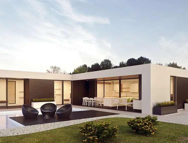 A minimalistic, L-shaped smart home featuring integrated lighting concepts, advanced pool controls, and elegantly connected indoor spaces.