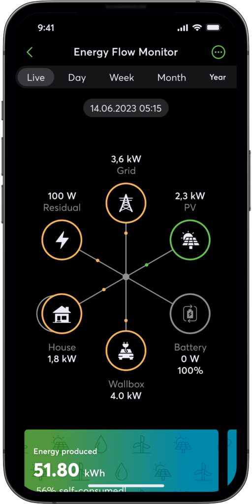 Our Smart Home system allows for comprehensive configurations for energy management and monitoring the energy consumption of lamps and household appliances. Integration of photovoltaic systems, wall boxes, and energy storage is easily possible. With Loxone, the system can also purchase electricity at the lowest prices and charge energy storage units. These functions are visible in the unified visualization of the energy monitor, making operation and monitoring easier.